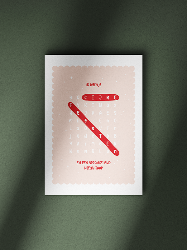 Een originele kerstkaart die uitnodigt om te puzzelen! Stuur wat winterse gezelligheid met deze creatieve kerstkaart vol woordplezier. Perfect voor puzzelfans of wie houdt van een speels ontwerp.