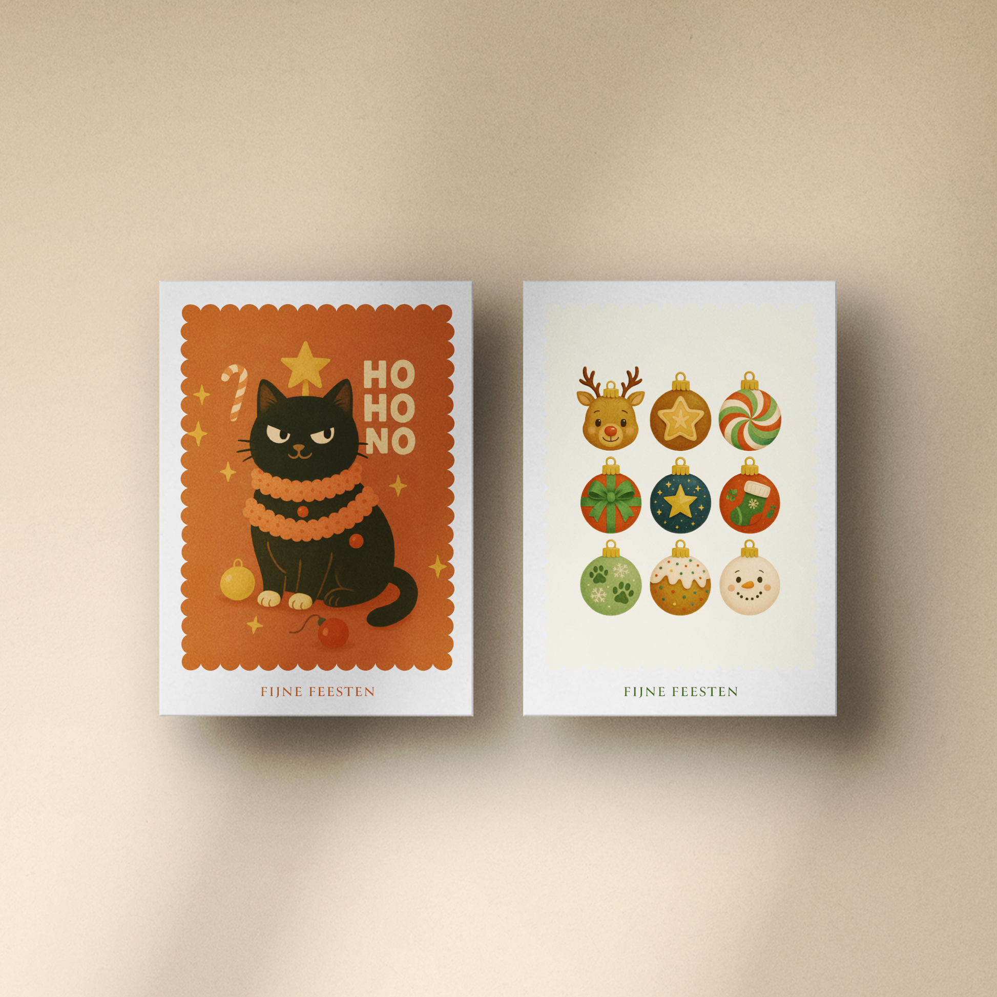 Een vrolijke kerstkaartenset met kattenhumor en kleurige kerstballen. Perfect voor dierenvrienden met gevoel voor humor.